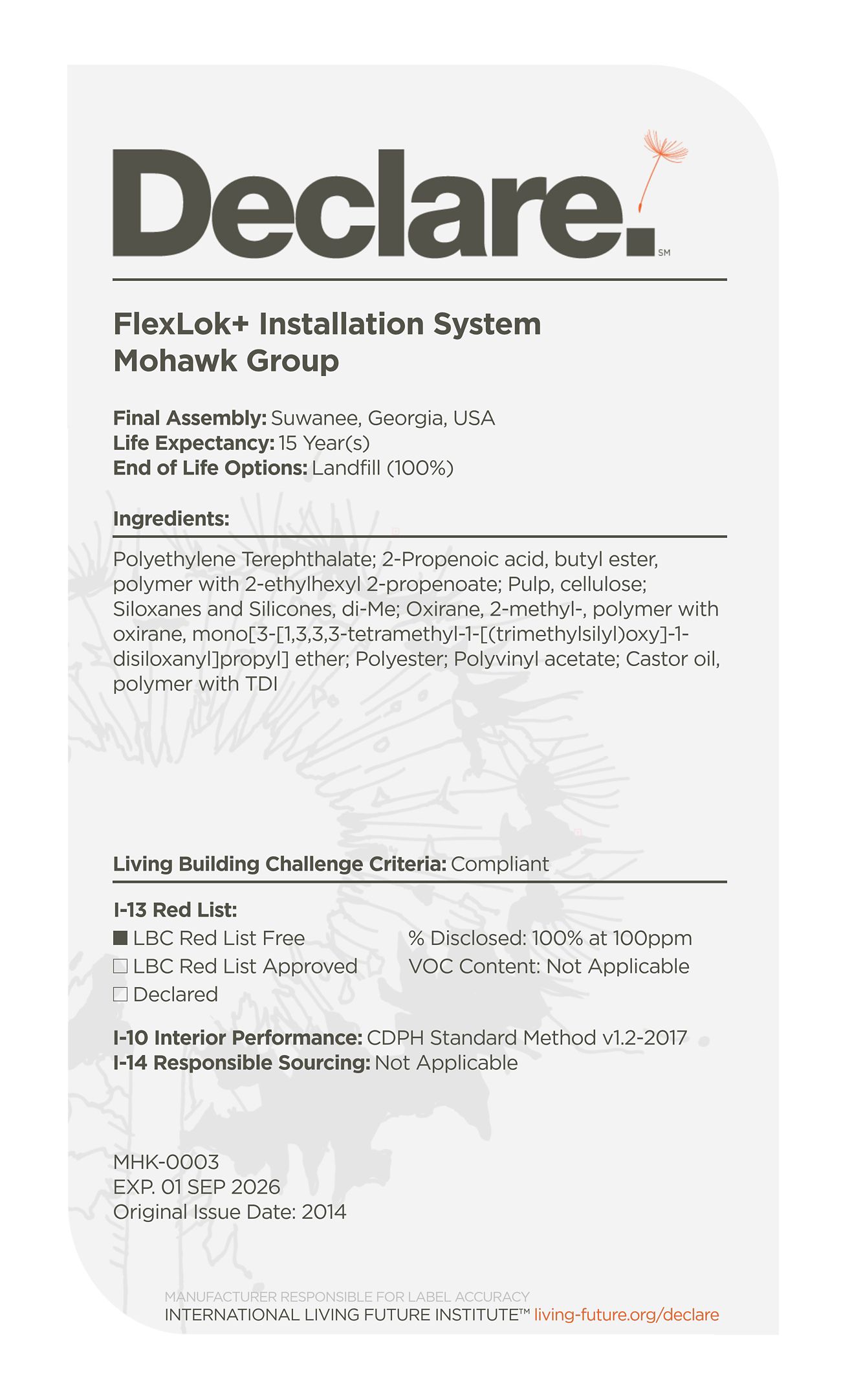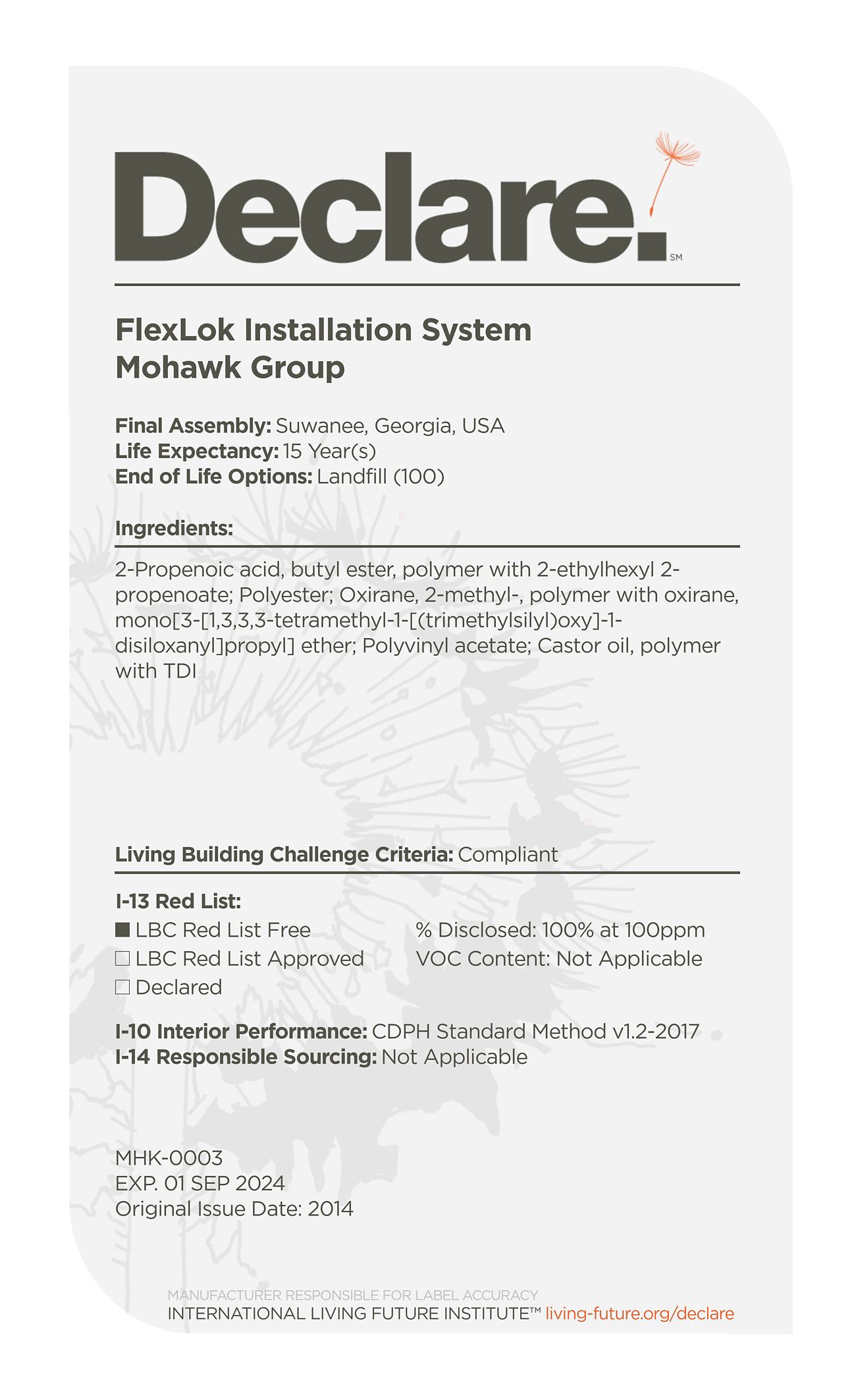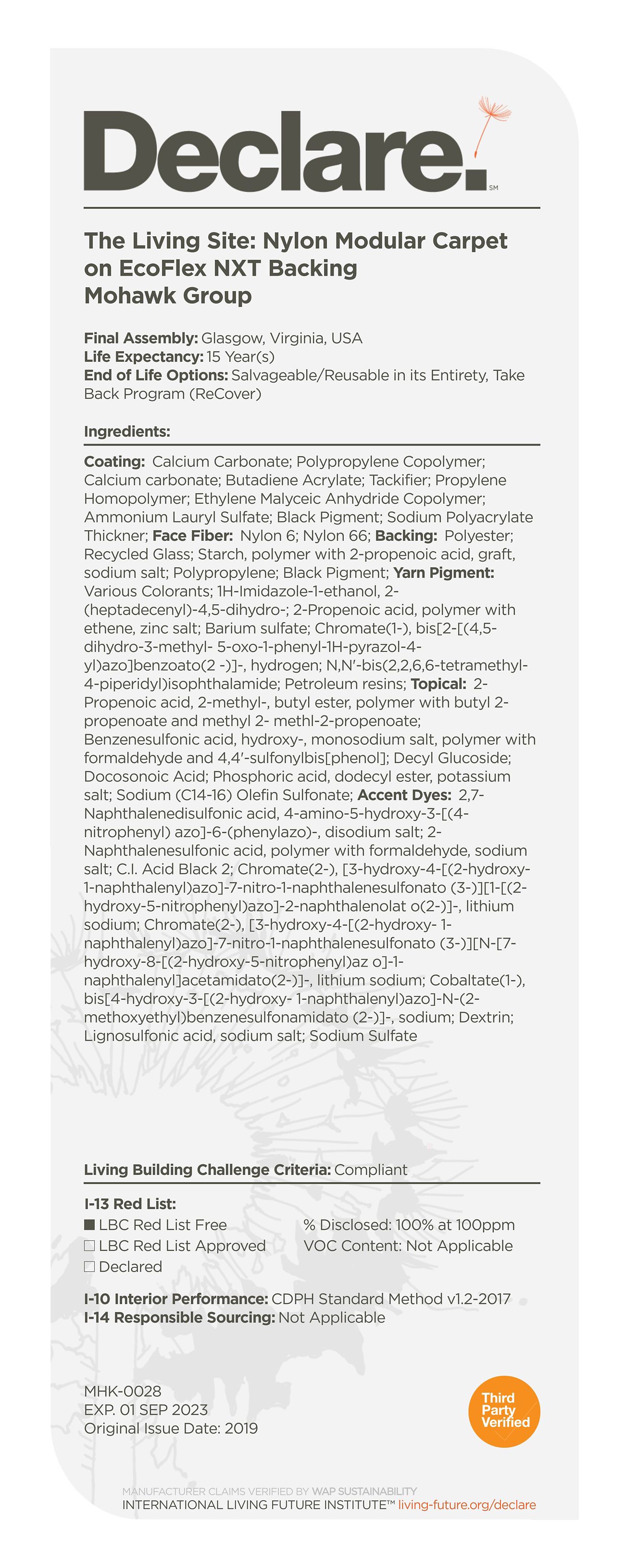 By providing a clear, elegant and informative "nutrition-label" for building products, Declare aligns with our commitment to transparency in support of the Living Building Challenge's Red List and Appropriate Sourcing Imperatives—streamlining material documentation and project certification.