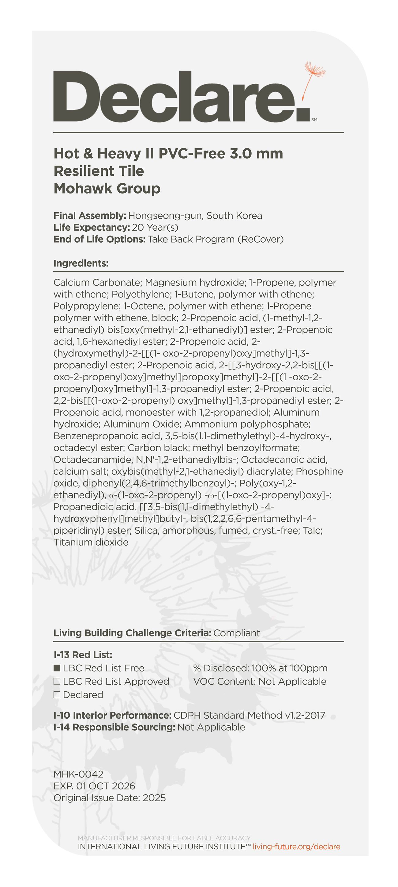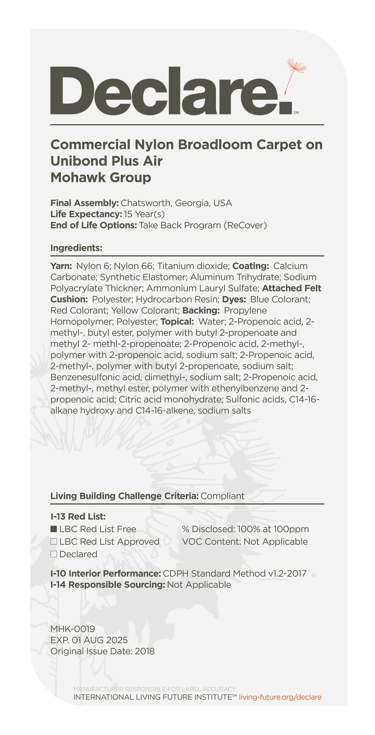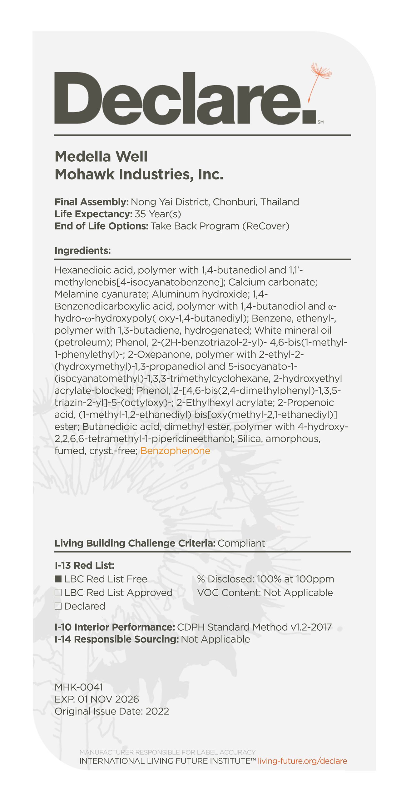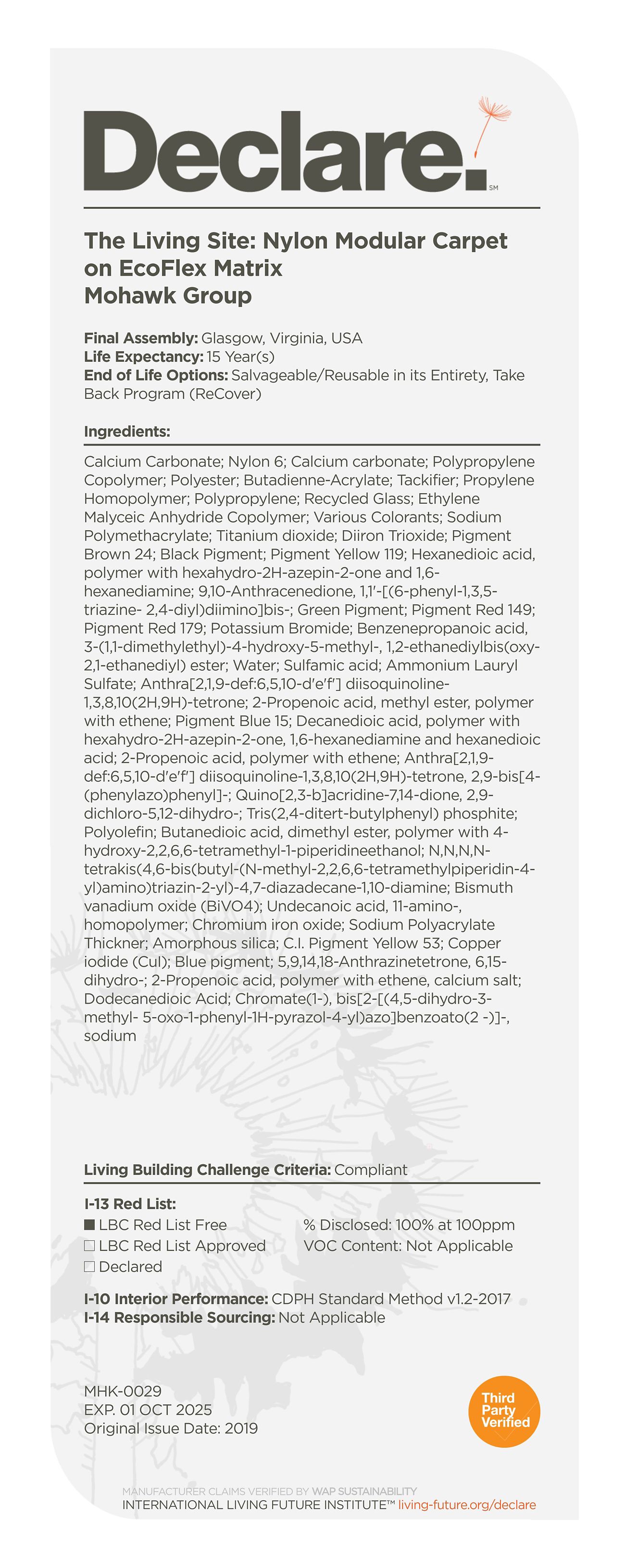 By providing a clear, elegant and informative "nutrition-label" for building products, Declare aligns with our commitment to transparency in support of the Living Building Challenge's Red List and Appropriate Sourcing Imperatives—streamlining material documentation and project certification.