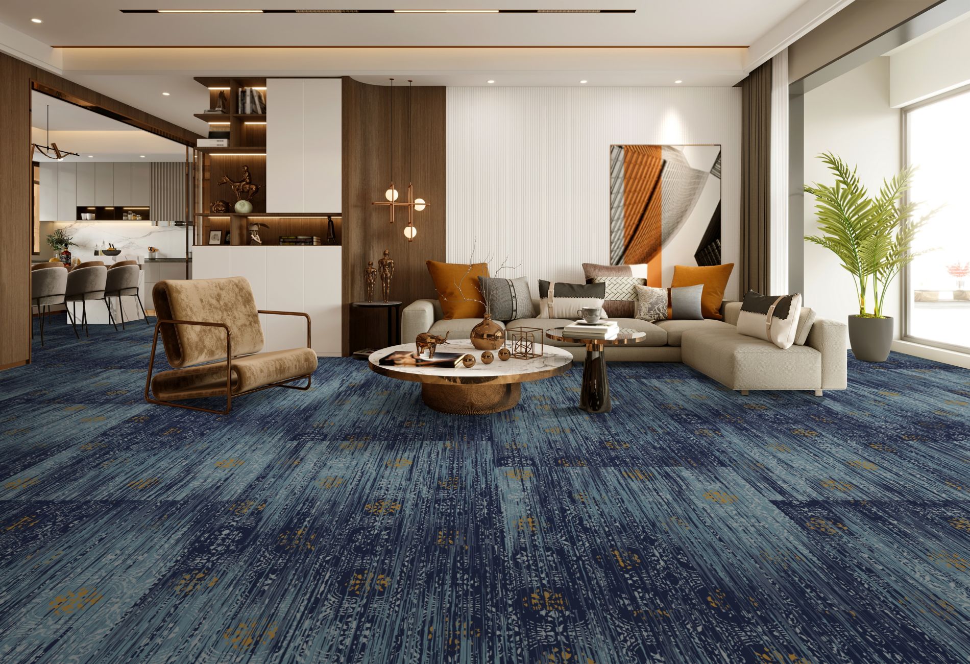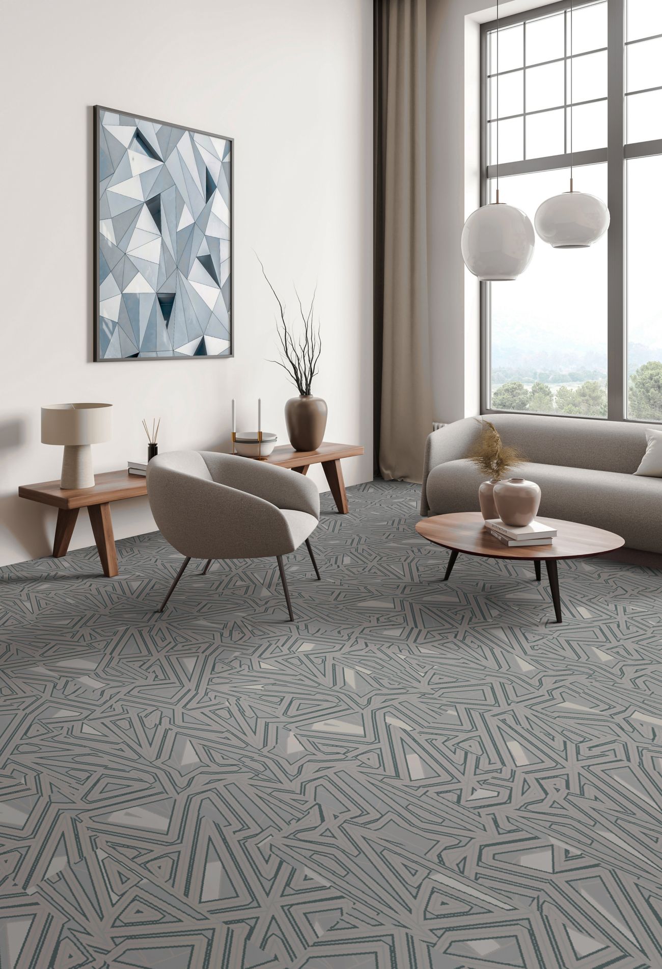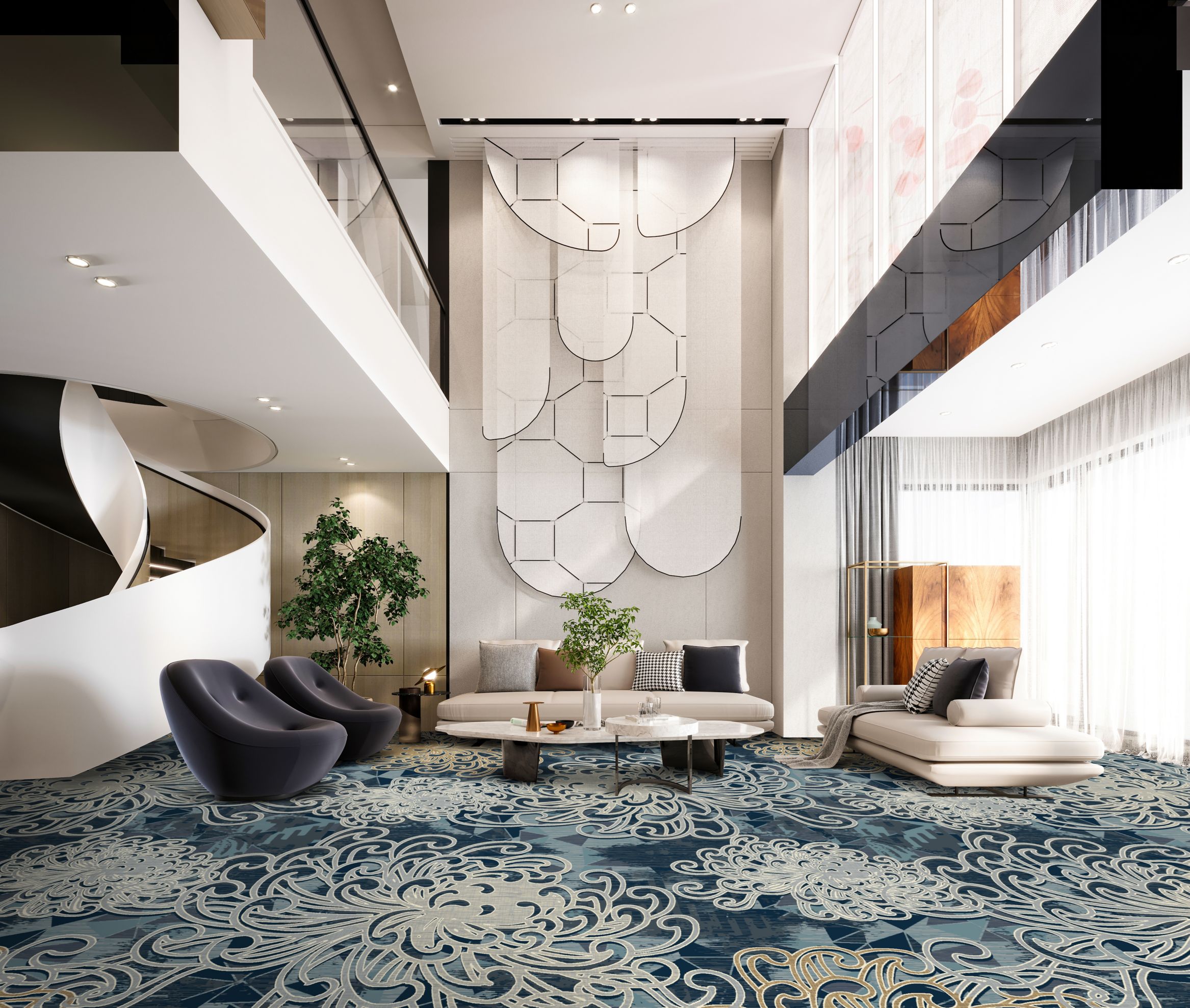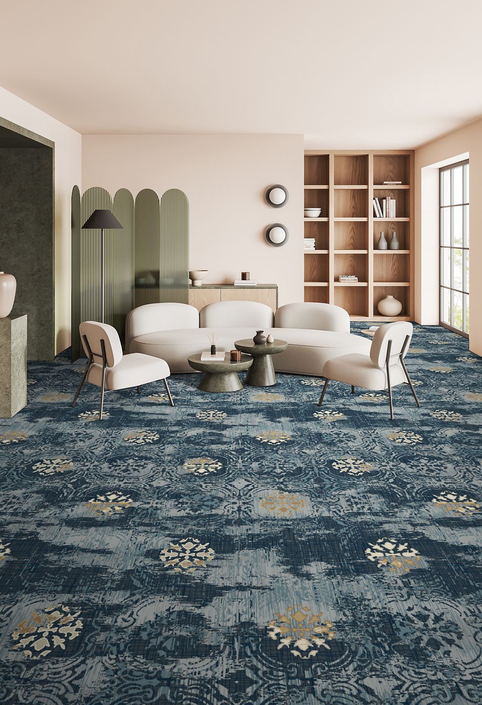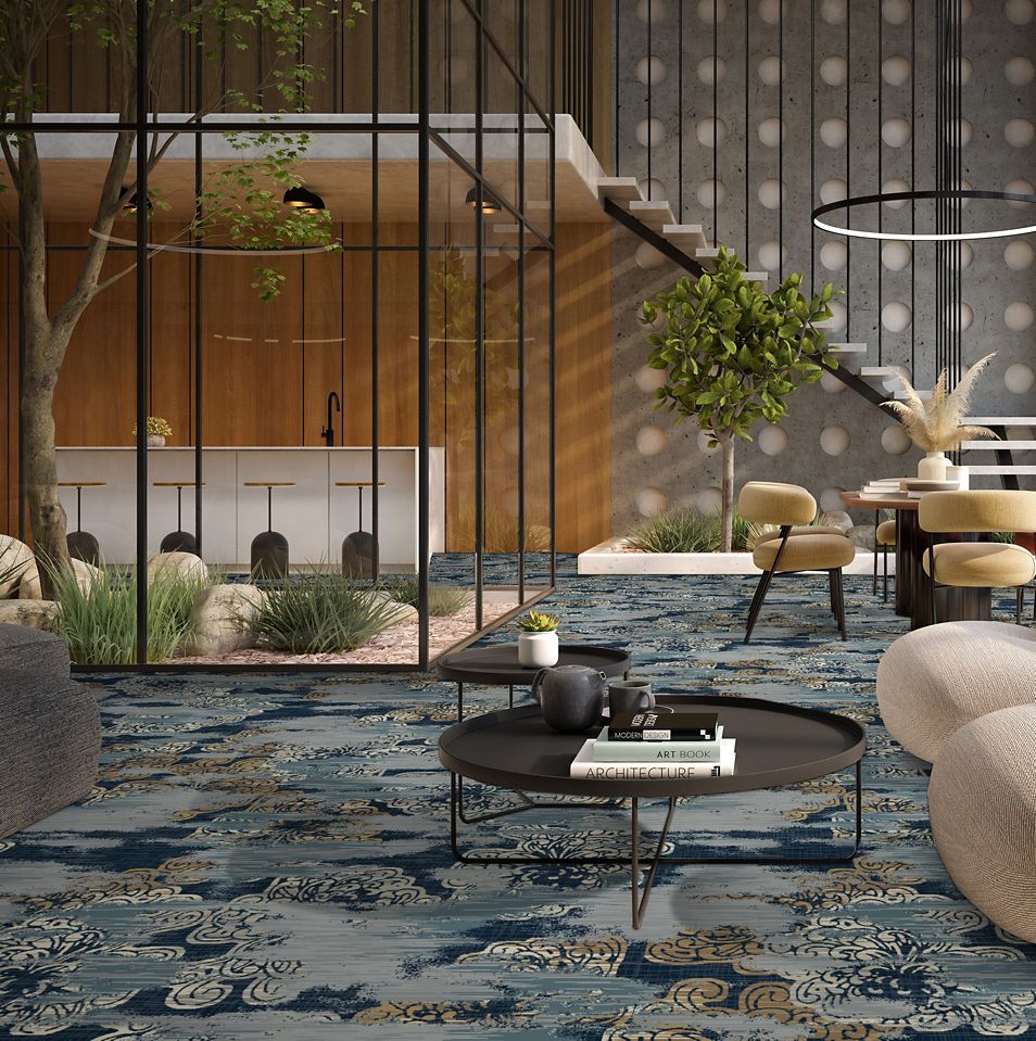 Discover the tranquil harmony of Japanese florals and geometric patterns in our Infuse 025 collection. Through a delicate fusion of florals and classic shapes, we achieve a captivating balance of softness and structure. Layered together, these elements offer a surprising sense of peace and fluidity. Our color palette, inspired by the serene essence of this collection, features tonal blues, greys, and caramel accents, inviting viewers into a world of tranquility. Experience the calming influence of nature's beauty and intricate design, seamlessly woven into every aspect of the Infuse 025 collection.