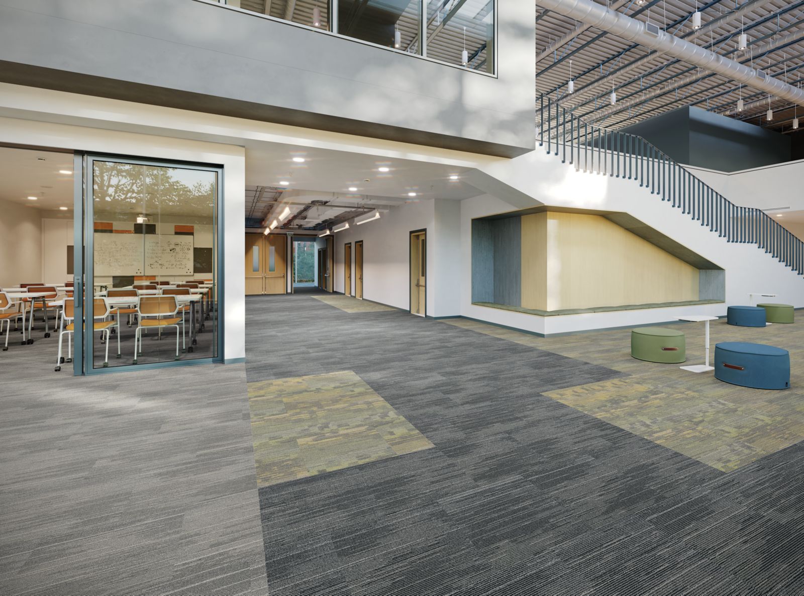 Inspired by the dits and dahs of Morse code, the earliest and most widely used form of electronic communication, the colorful thread-up of the SwitchCode carpet tile collection was created by using Morse code as a creel map. Words that evoke academic and creative achievement were inventively used to randomize the thread-up of the patterns and create visuals that stimulate imagination.