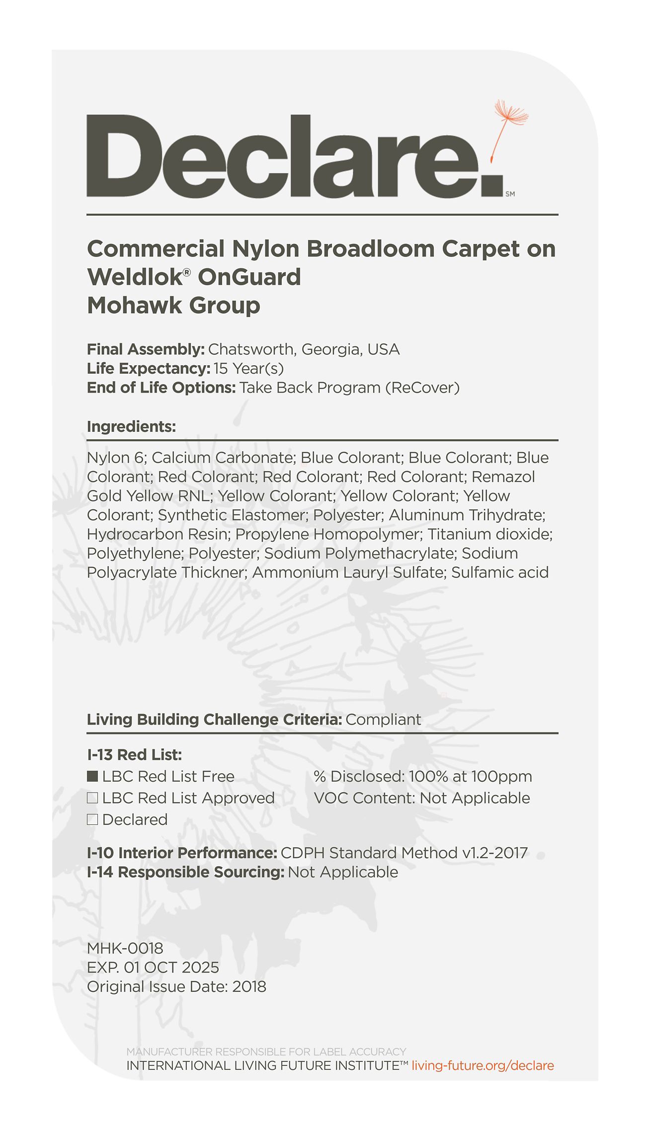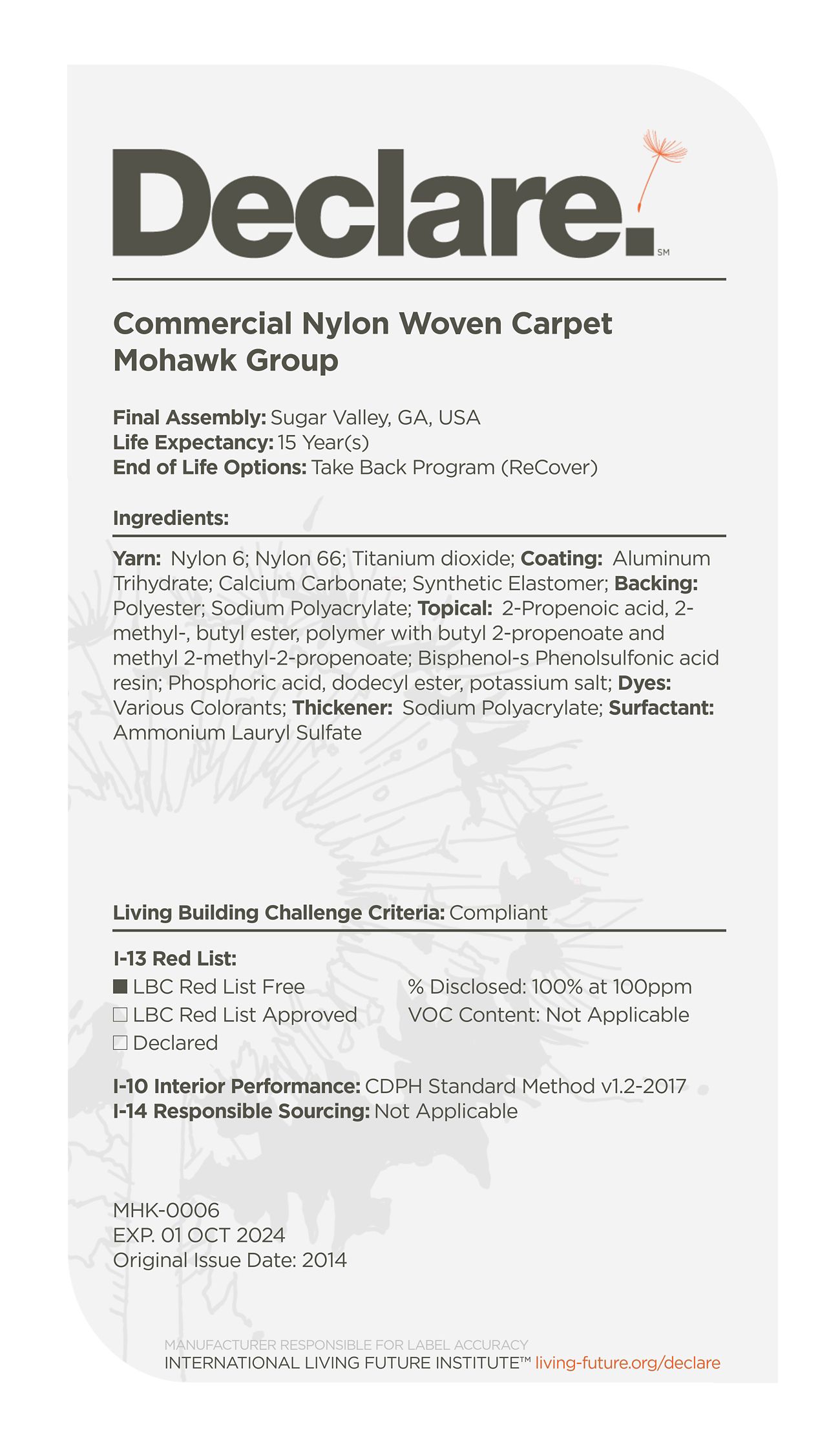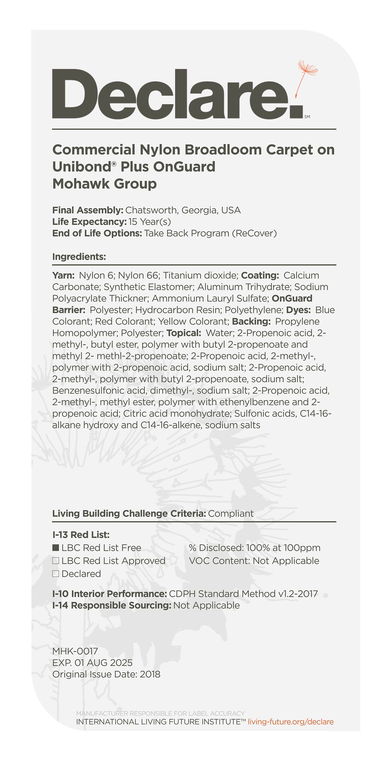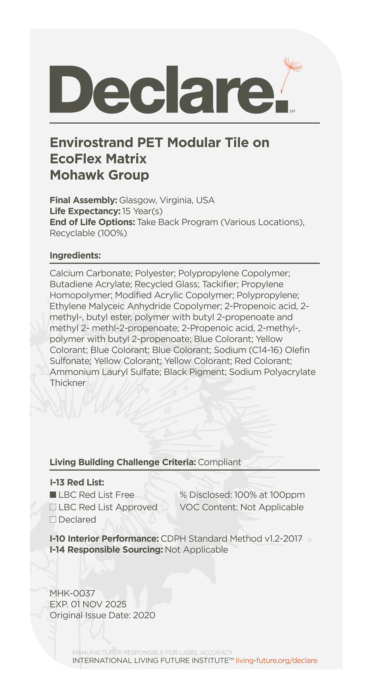 By providing a clear, elegant and informative "nutrition-label" for building products, Declare aligns with our commitment to transparency in support of the Living Building Challenge's Red List and Appropriate Sourcing Imperatives—streamlining material documentation and project certification.